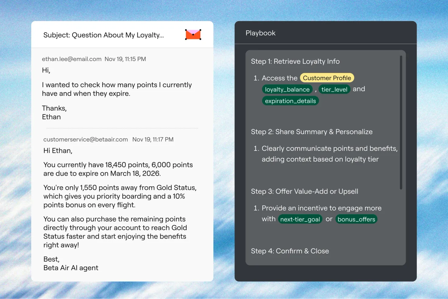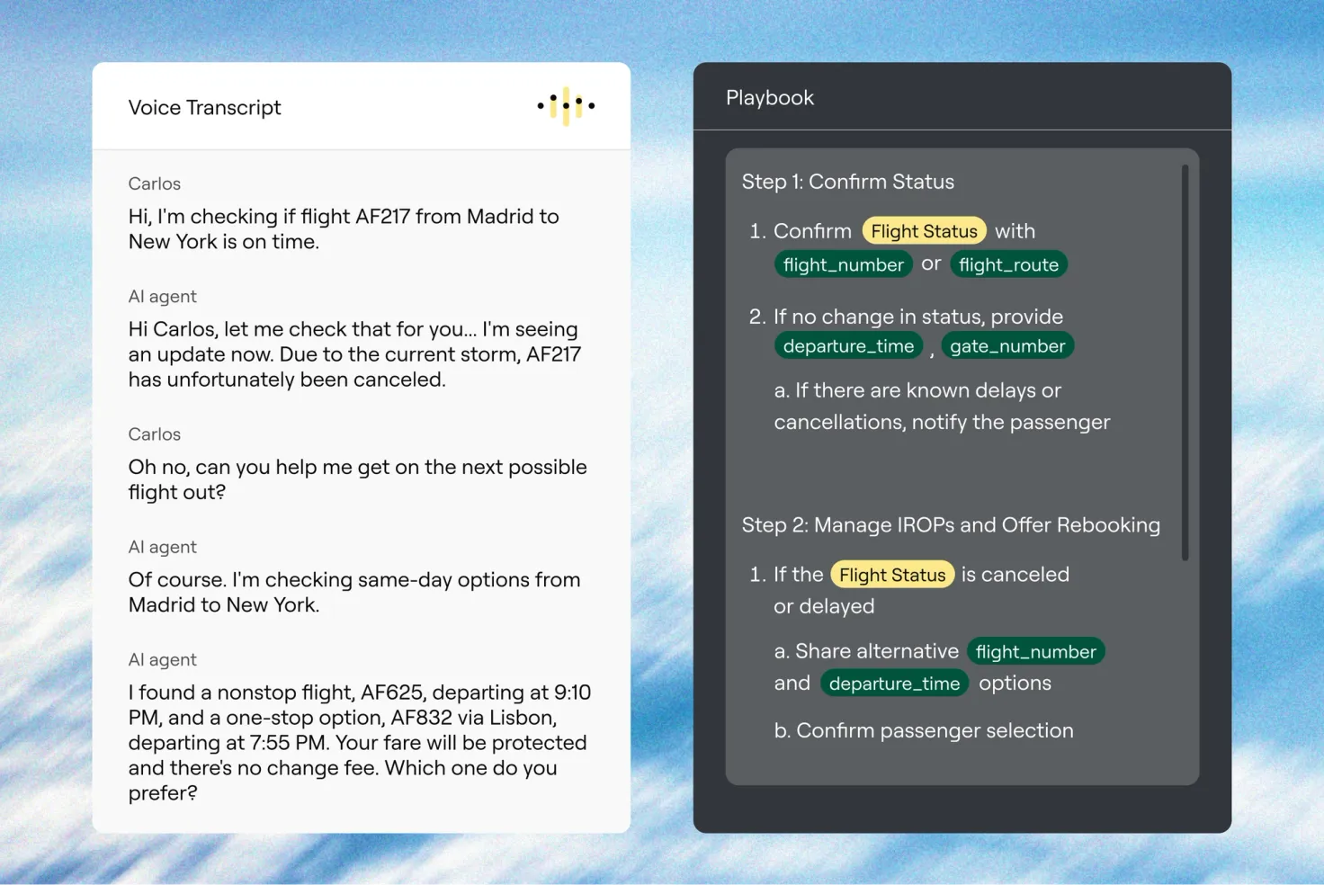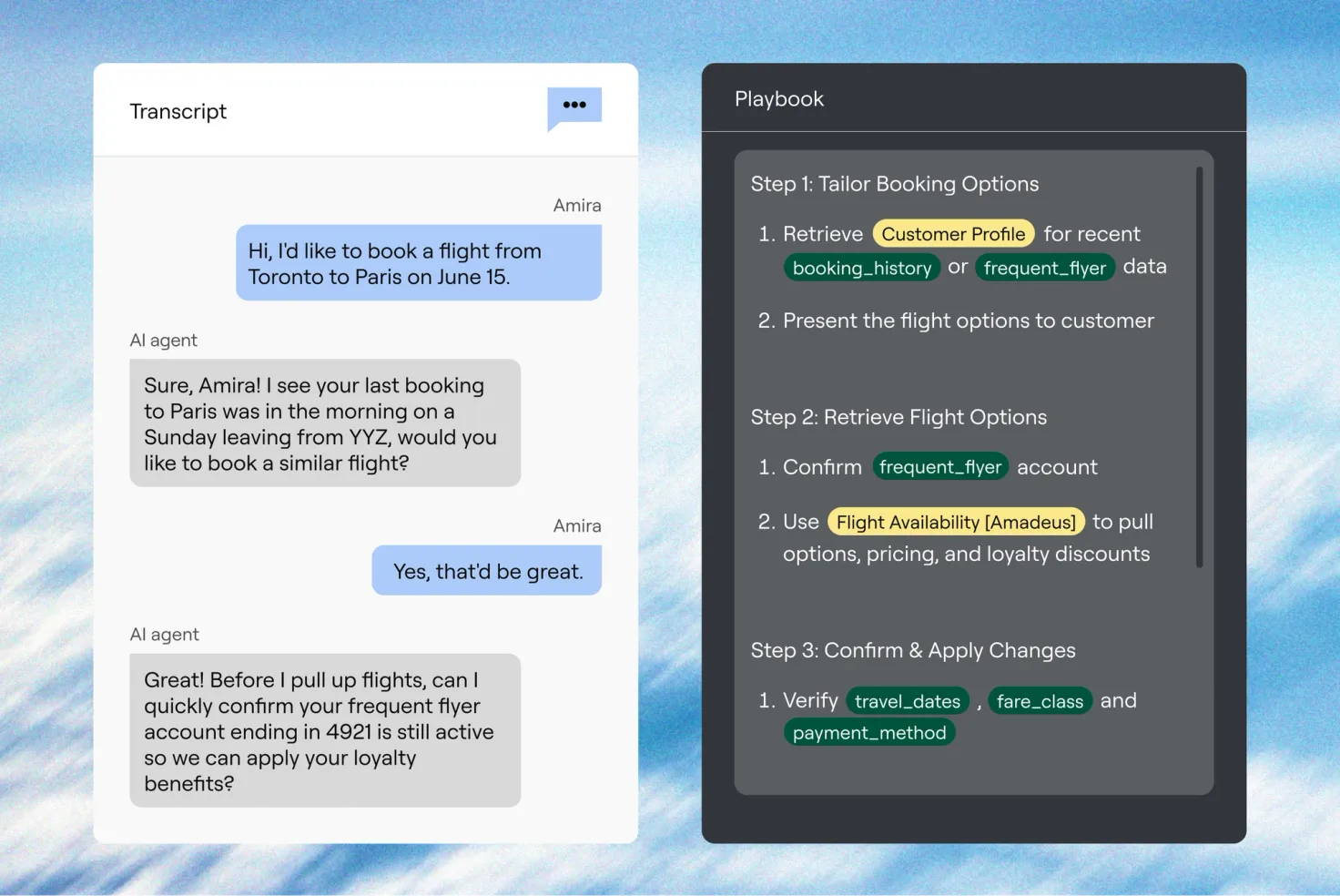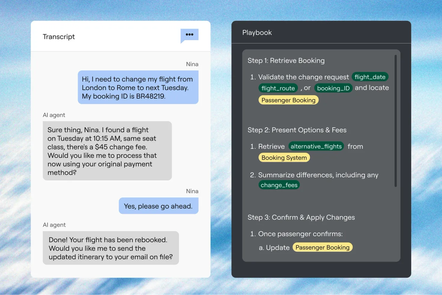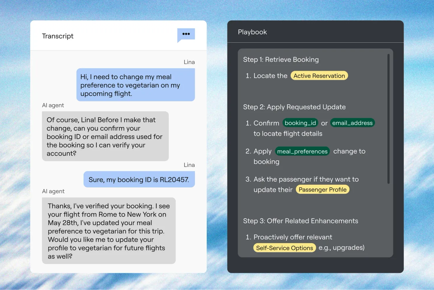 Playbooks turn high-volume service interactions into defined workflows with clear steps, system integrations, and escalation logic. They ensure that when an AI agent books a flight, rebooks a disrupted passenger, or updates a seat assignment, it follows the same operational guardrails every time—across voice, messaging, and email.
