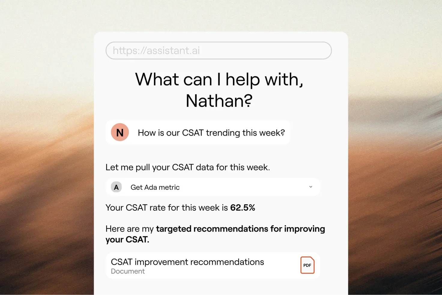 Conversational analytics bridges the gap between raw numbers and real understanding. It gives authorized teams the ability to explore Ada data in natural language and share insights that drive meaningful action across the business.