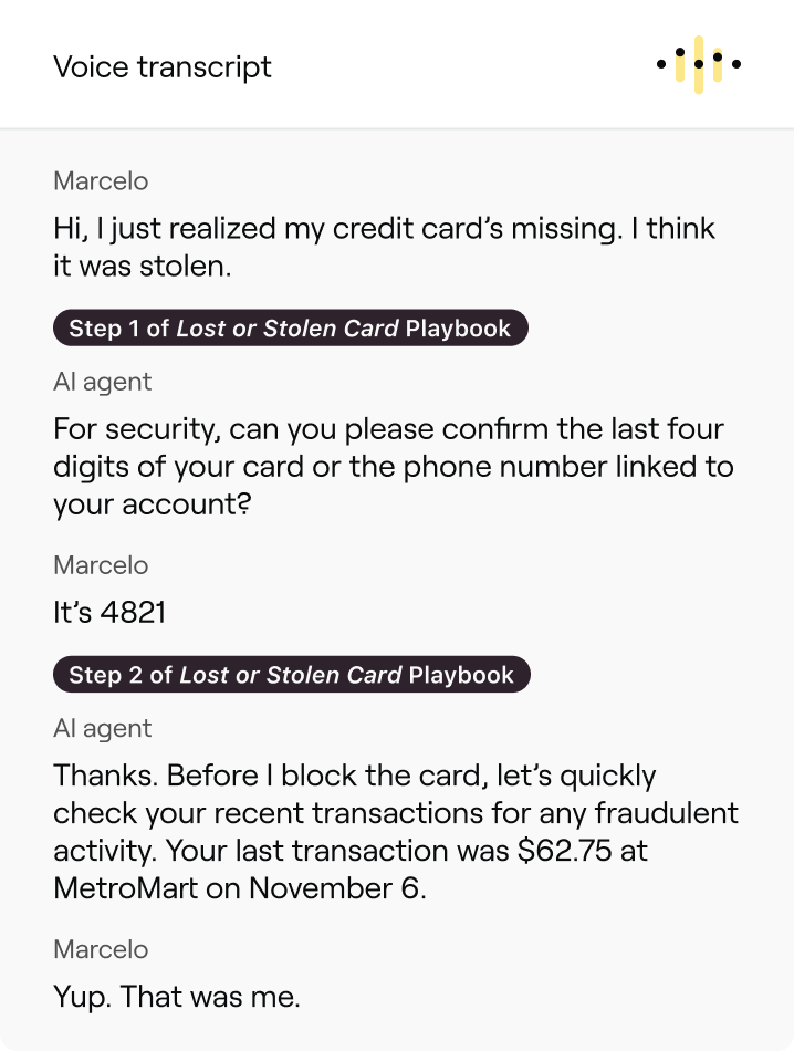 Handle complex tasks with structured workflows. Playbooks let your AI agent follow multi-step SOPs using real-time data, without relying on rigid, scripted frameworks.