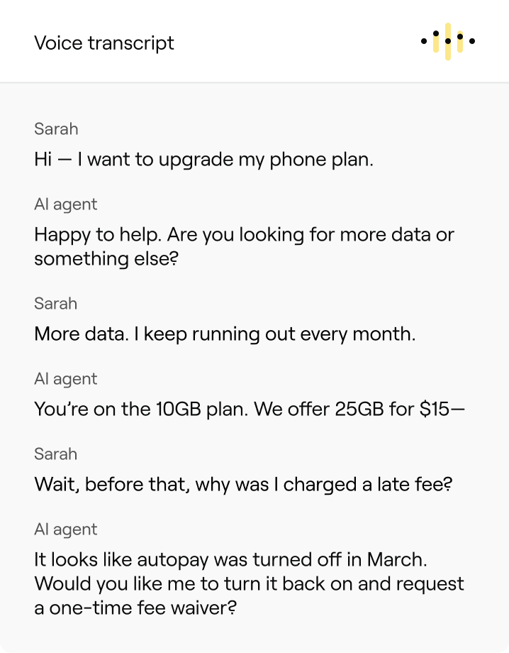 Autonomously resolve complex customer issues with fast, deeply personalized voice AI agents.