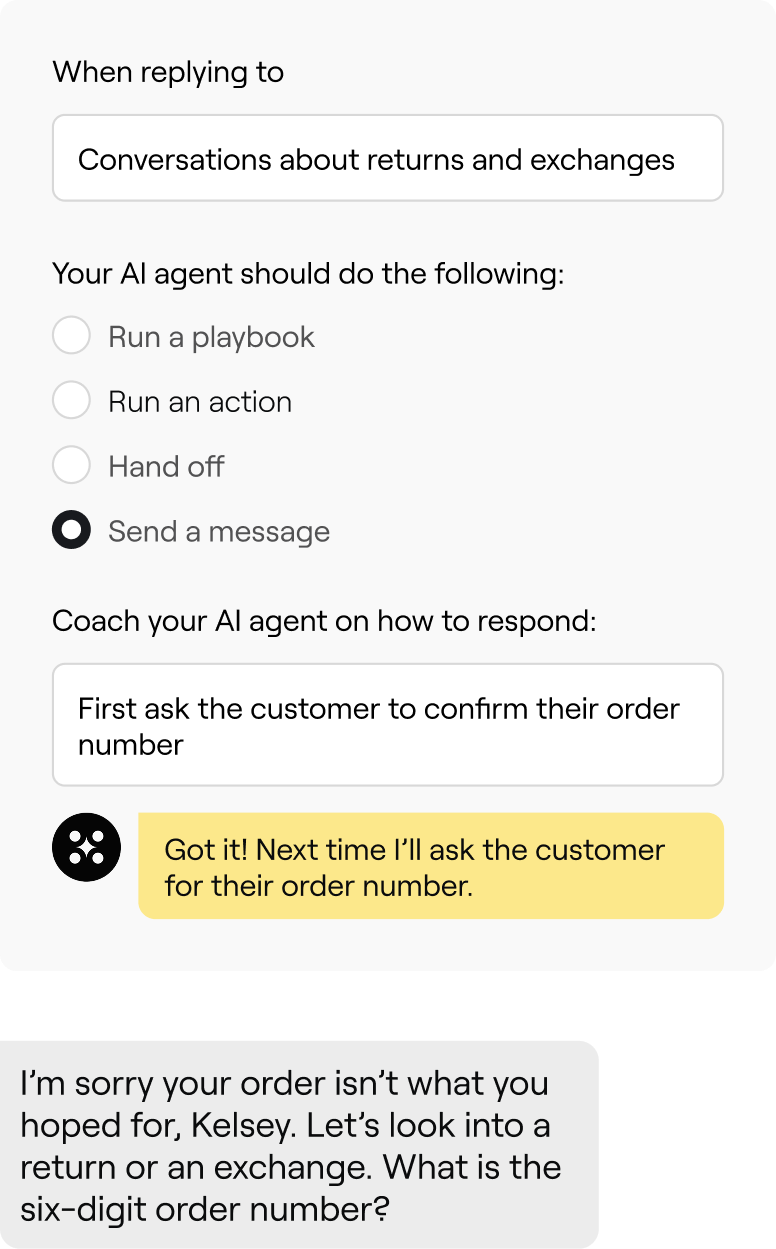 Refine tone, context, and answers with Coaching. Updates apply automatically across channels, tightening the loop between insight and improvement.
